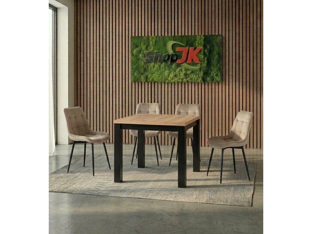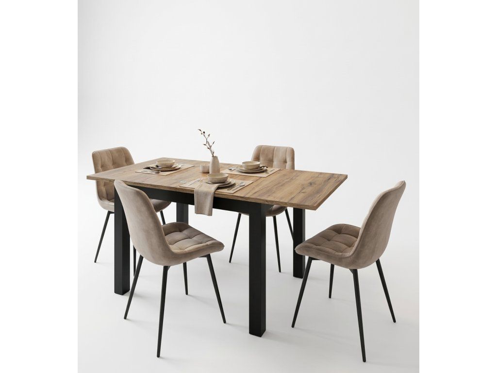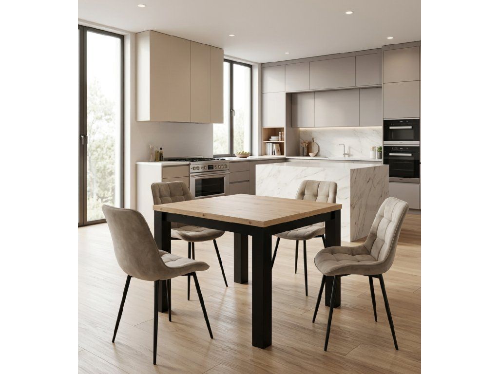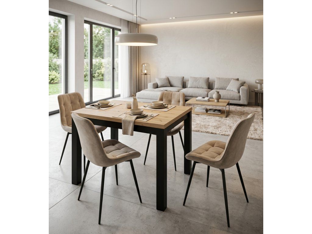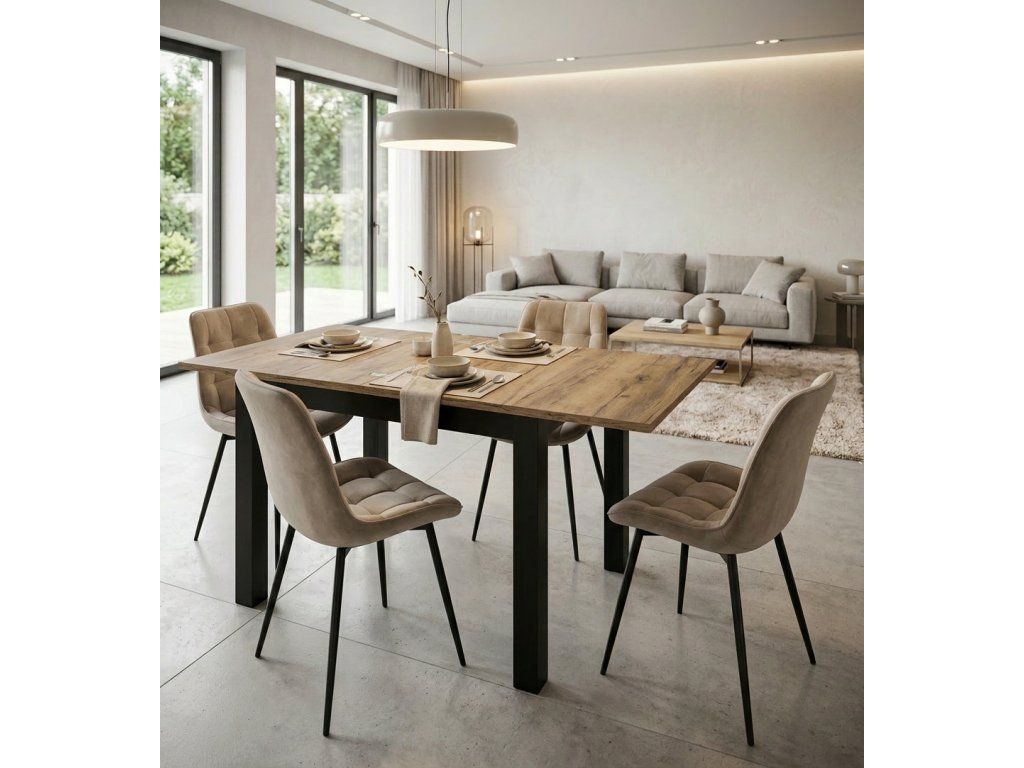 Stôl tvorí dominantný prvok celej zostavy. Doska v dekore dreva prináša do priestoru prirodzenosť a teplo, zatiaľ čo čierna konštrukcia zabezpečuje stabilitu a moderný vzhľad. Tento kontrast patrí medzi najvyhľadávanejšie kombinácie v interiérovom dizajne.