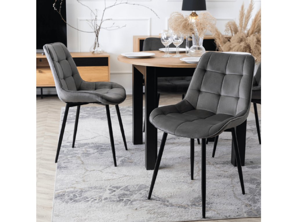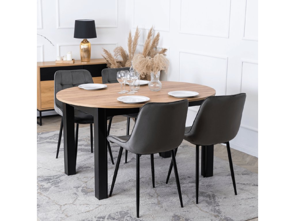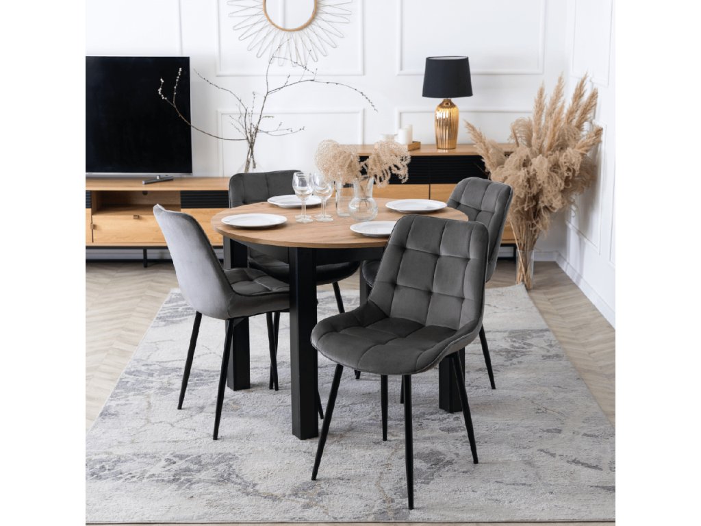 Kombinácia okrúhleho rozkladacieho stola Harry v remeselnom dube a štyroch sivých zamatových stoličiek Chris vytvára moderný, pohodlný a nadčasový priestor pre rodiny aj páry. Tento set je ideálnou voľbou do kuchyne, jedálne aj menšej obývačky.
