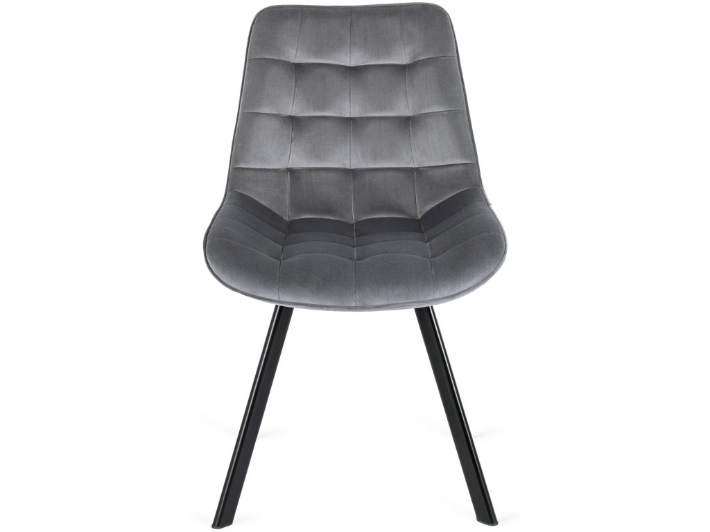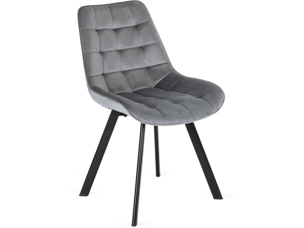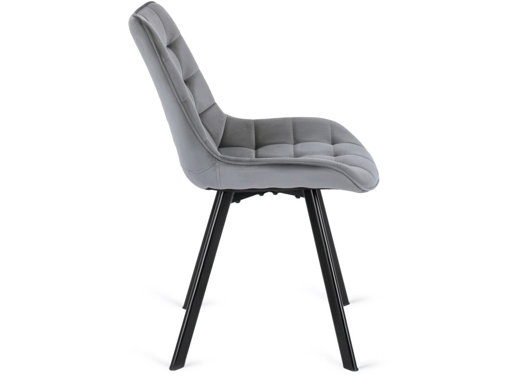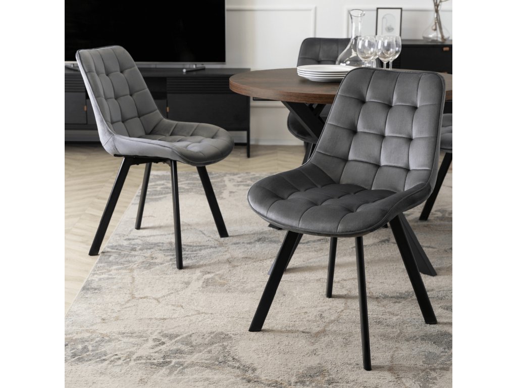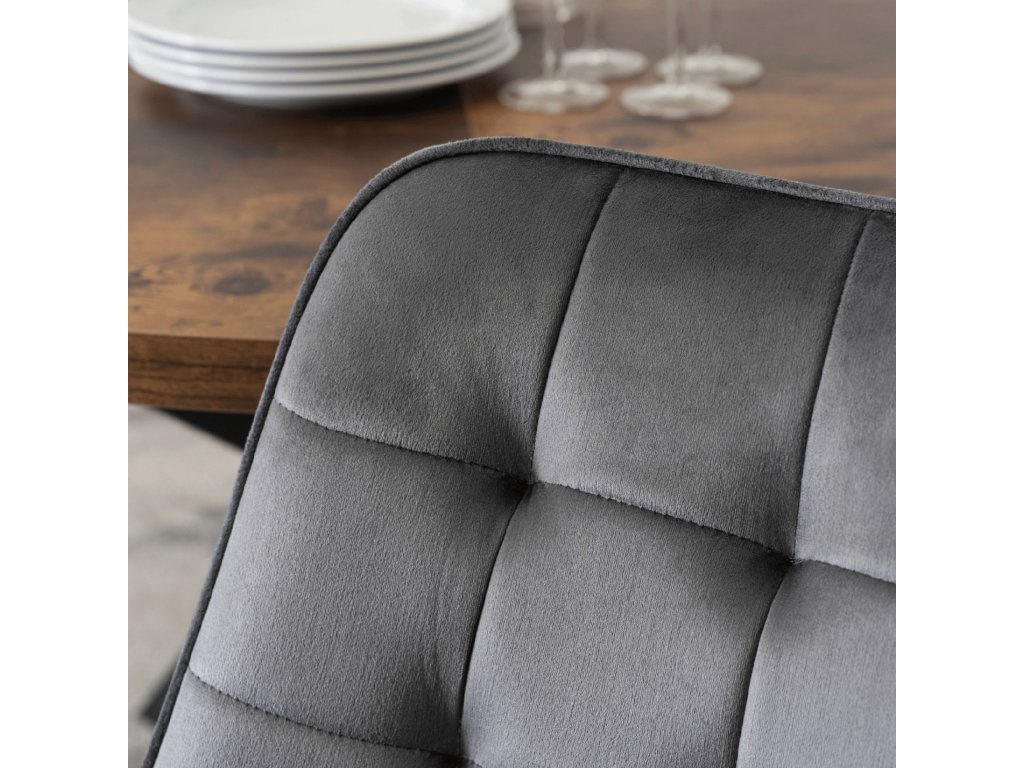 Stoličky Rick sú navrhnuté tak, aby poskytovali pohodlie aj pri dlhšom sedení. Sivý zamatový poťah je mäkký, príjemný na dotyk a vizuálne dopĺňa rustikálny dub stola. Profilované operadlo a prešívanie dodávajú stoličkám moderný vzhľad a kvalitnú oporu.
