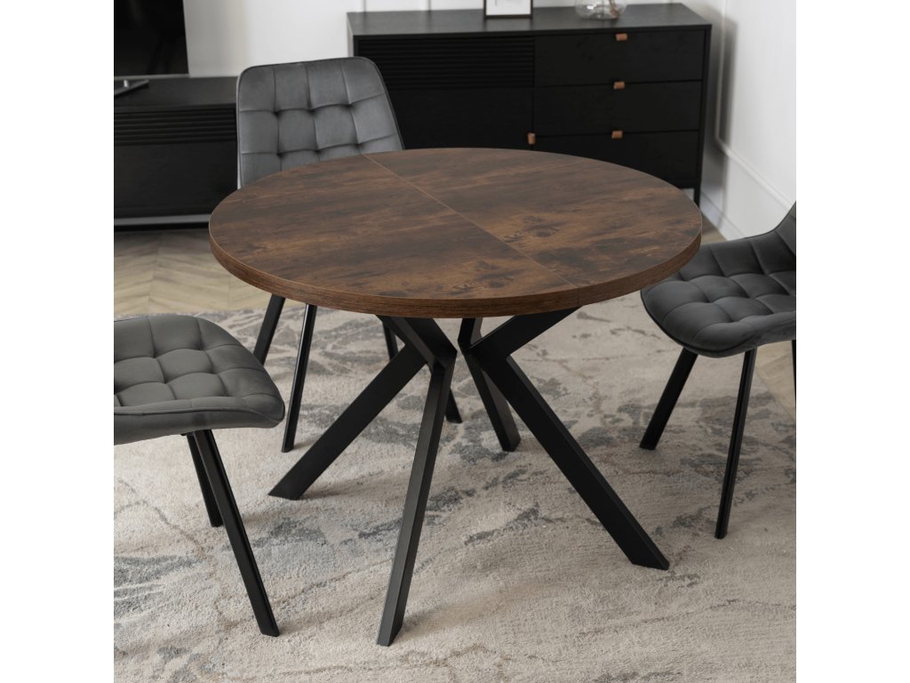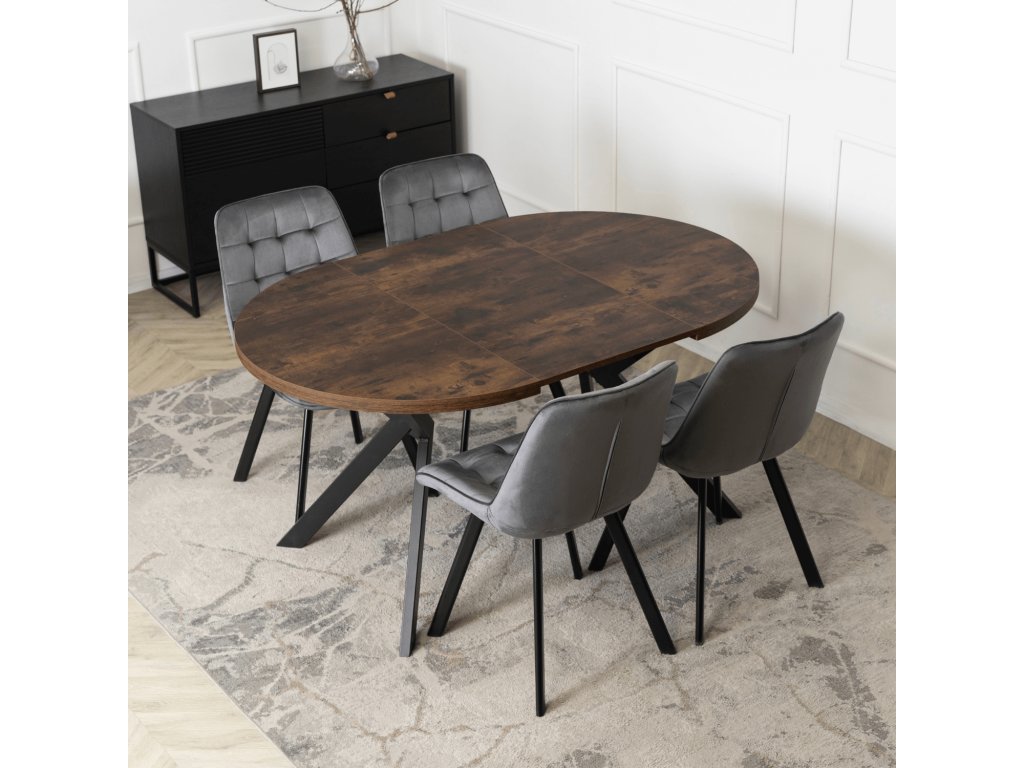 Jedálenská zostava Lukas & Rick kombinuje okrúhly rozkladací stôl ( 100 – 250 cm ) v dekore rustikálny dub s čiernou kovovou podnožou a štyri sivé stoličky so zamatovým čalúnením. Ponúka moderný vzhľad, vysoký komfort a praktické využitie pre menšie aj väčšie jedálne.