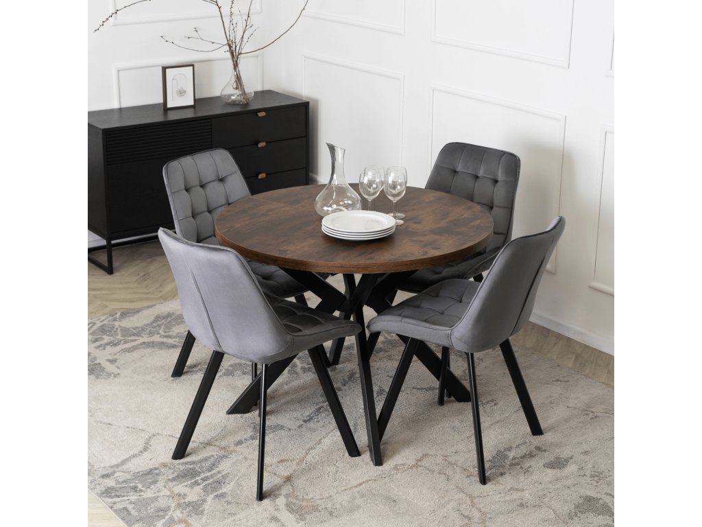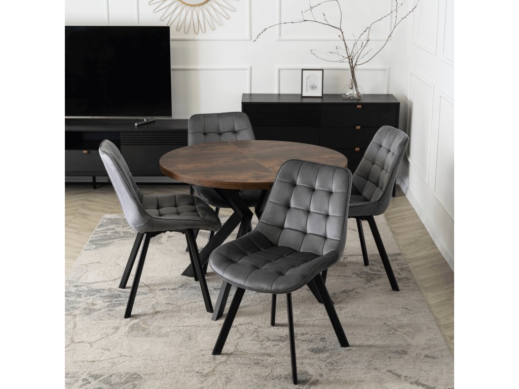Jedálenská zostava Lukas & Rick, okrúhly rozkladací stôl a 4 sivé zamatové stoličky v modernom rustikálnom štýle