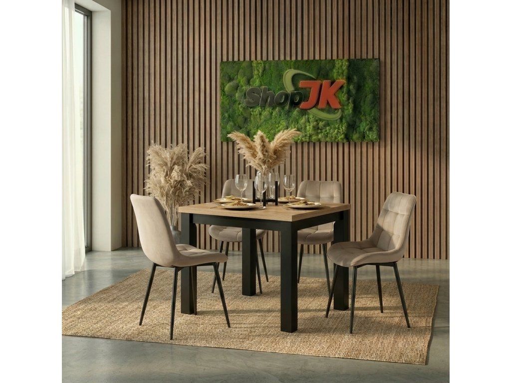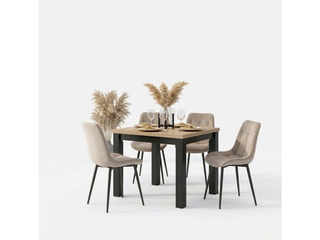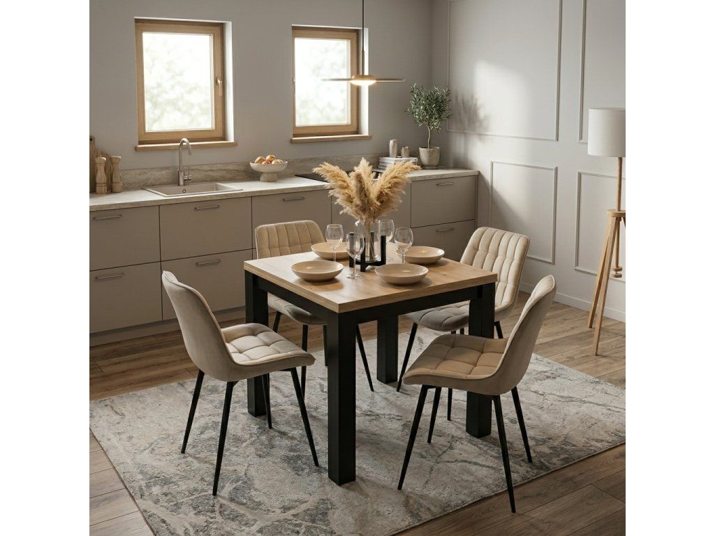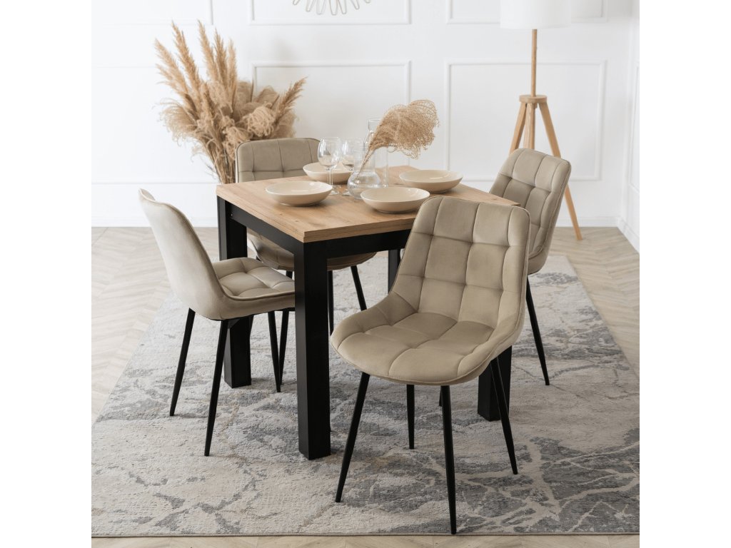 Jedálenská zostava Max & Chris obsahuje rozkladací štvorcový stôl v dekore remeselný dub/čierna a štyri béžové zamatové stoličky. Je ideálna do menších aj stredne veľkých priestorov, poskytuje komfortné sedenie, moderný vzhľad a praktické využitie v kuchyni alebo jedálni.
