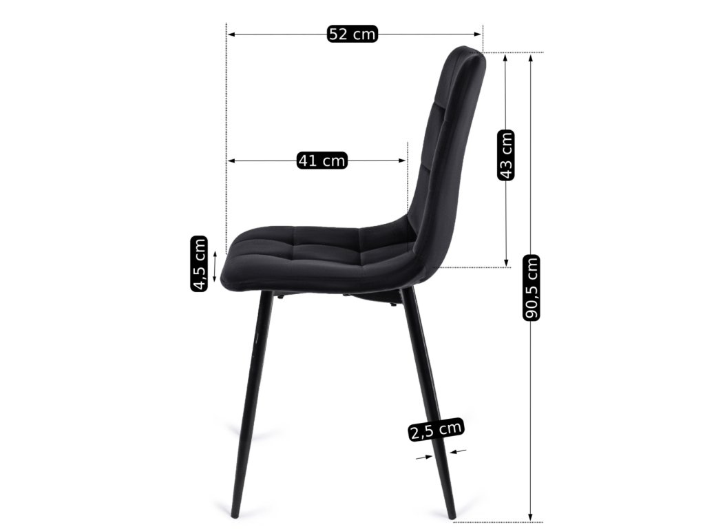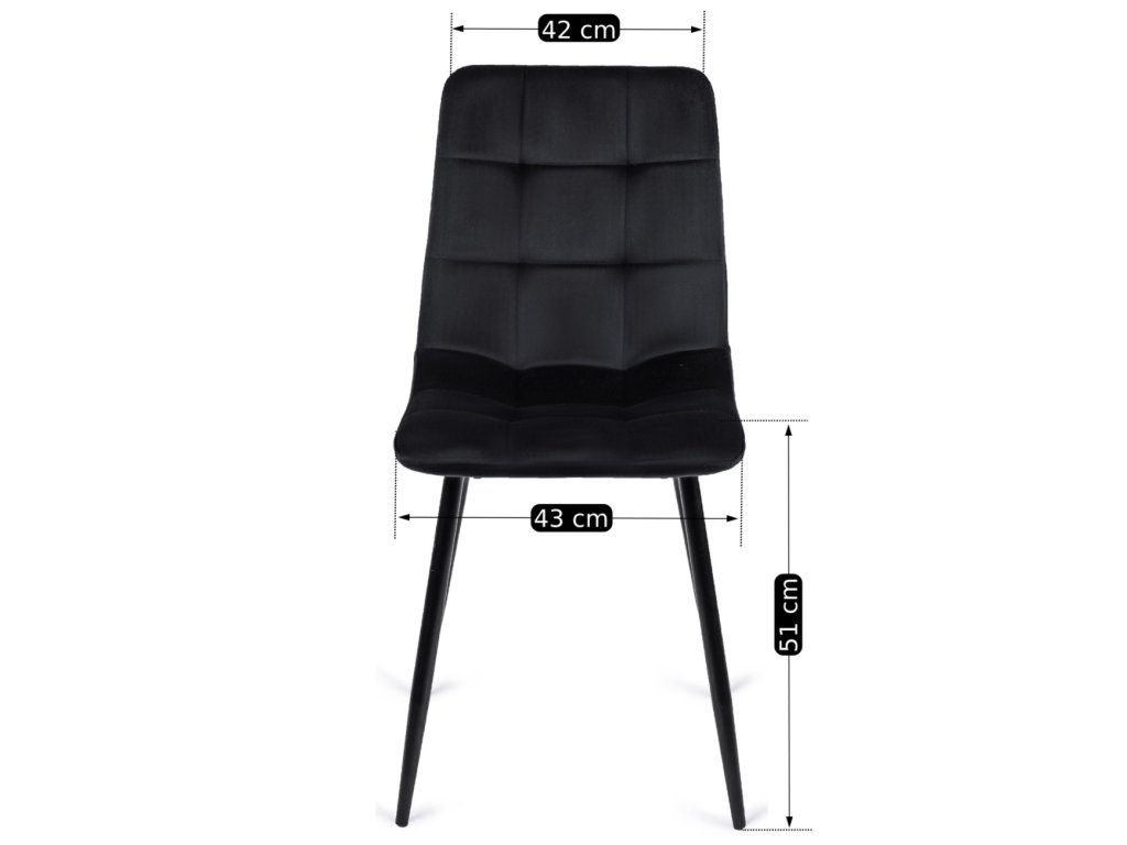 Štyri stoličky peru dopĺňajú stôl dokonale, farebne aj tvarovo. Ich čierne zamatové čalúnenie pôsobí luxusne, je mäkké na dotyk a krásne odráža svetlo. Sedadlo a operadlo vyplnené kvalitnou penou poskytujú príjemné sedenie aj pri dlhších rozhovoroch pri stole.