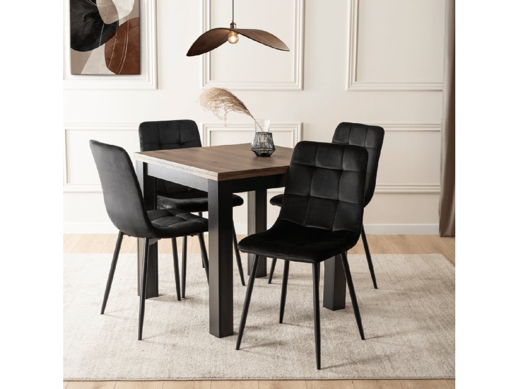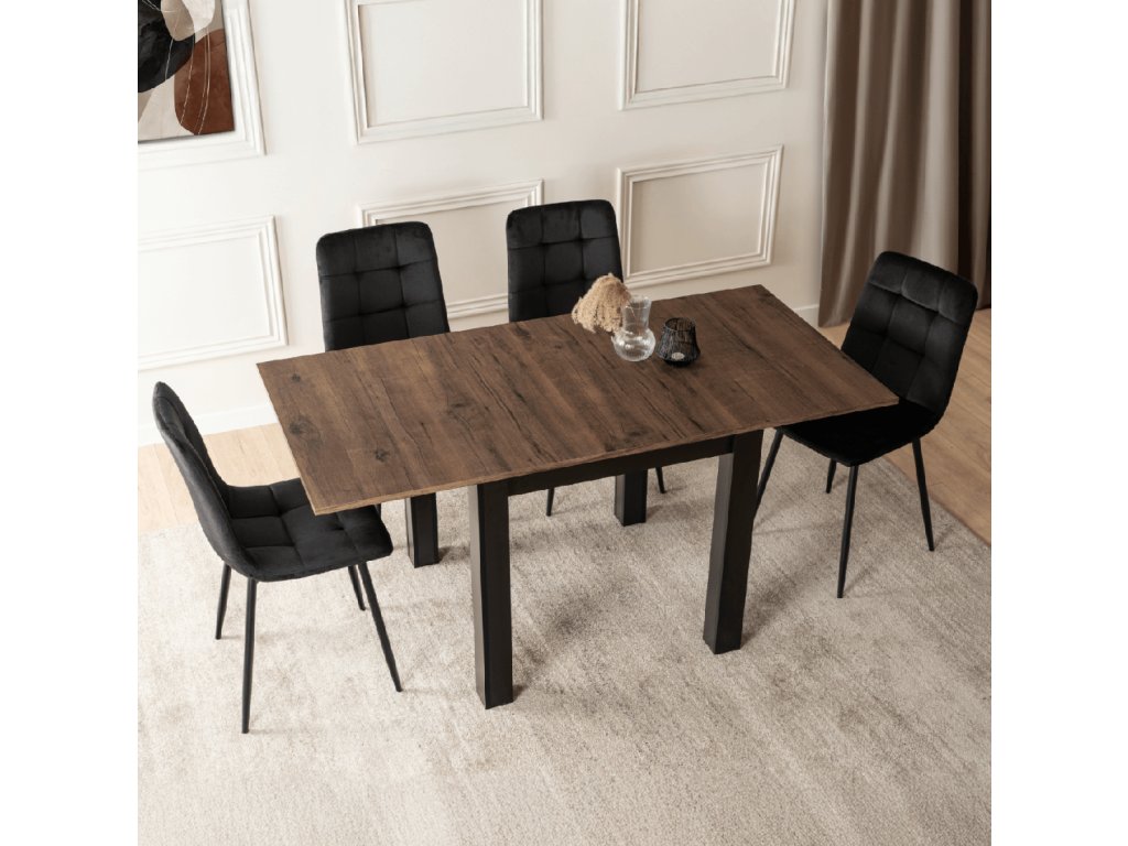 Jedálenská zostava Max a Peru kombinuje rozkladací štvorcový stôl 80 – 160 cm v orechovom dekore a štyri čierne zamatové stoličky. Ponúka moderný dizajn, stabilitu a pohodlné sedenie pre kuchyne a jedálne.