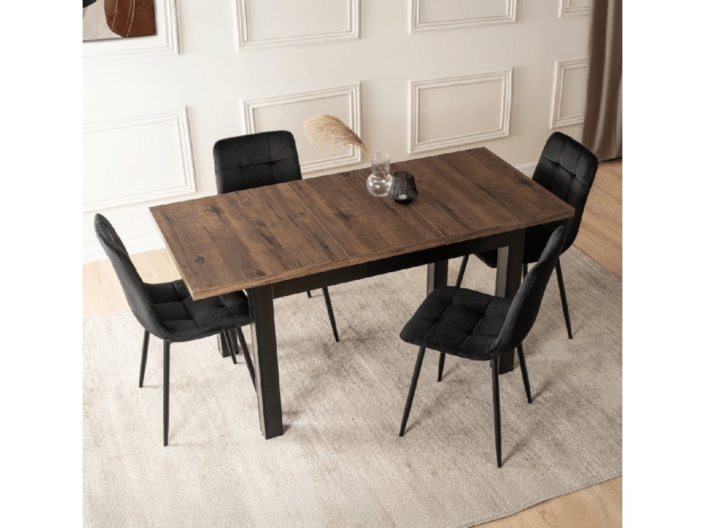 Jedálenská zostava Skubi a Peru, rozkladací orechový stôl a 4 čierne zamatové stoličky v modernom dizajne
