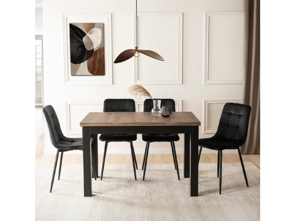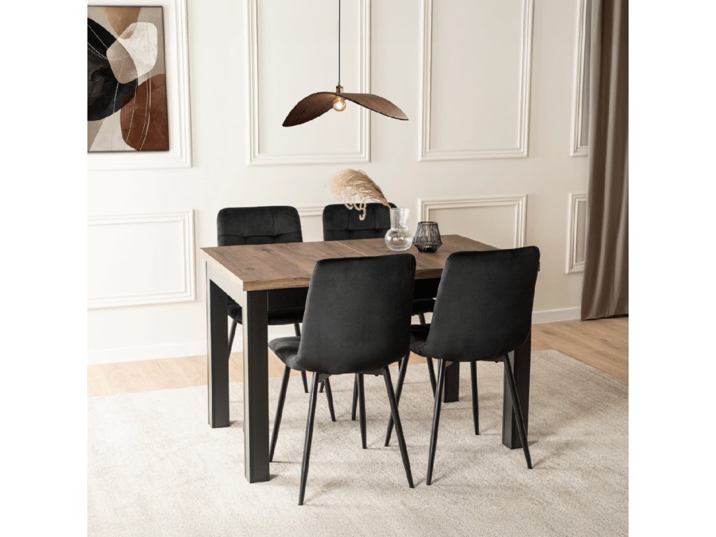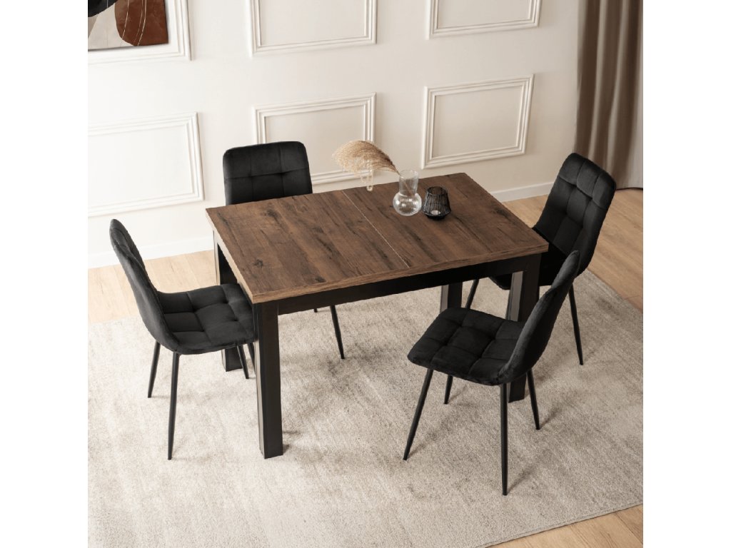 Jedálenská zostava Skubi a Peruje kombinácia kvalitného rozkladacieho stola v orechovom dekore a štyroch čiernych zamatových stoličiek, ktorá vytvára priestor plný elegancie, tepla a funkčnosti. Ideálna pre rodiny, moderné domácnosti aj minimalistické interiéry.