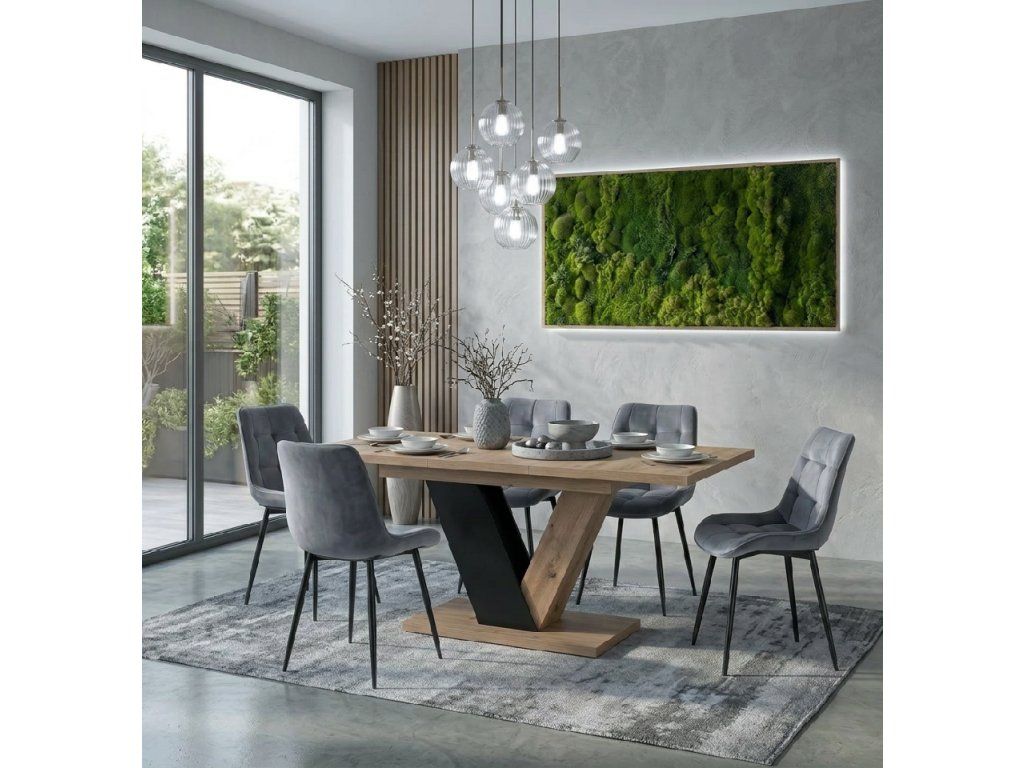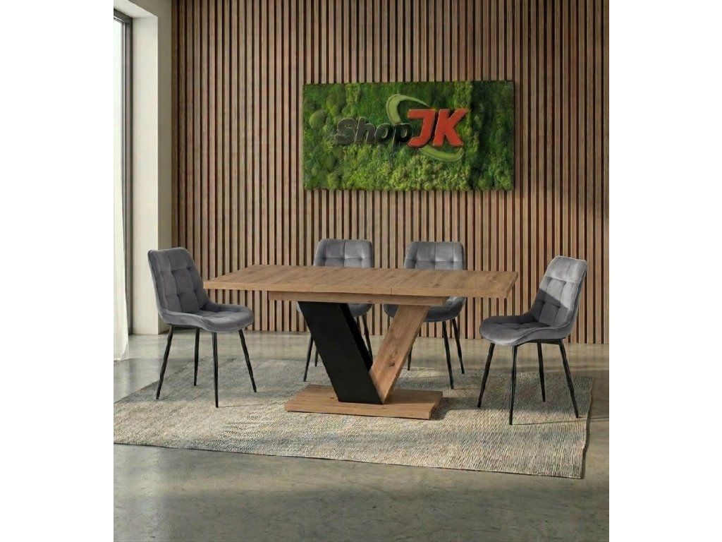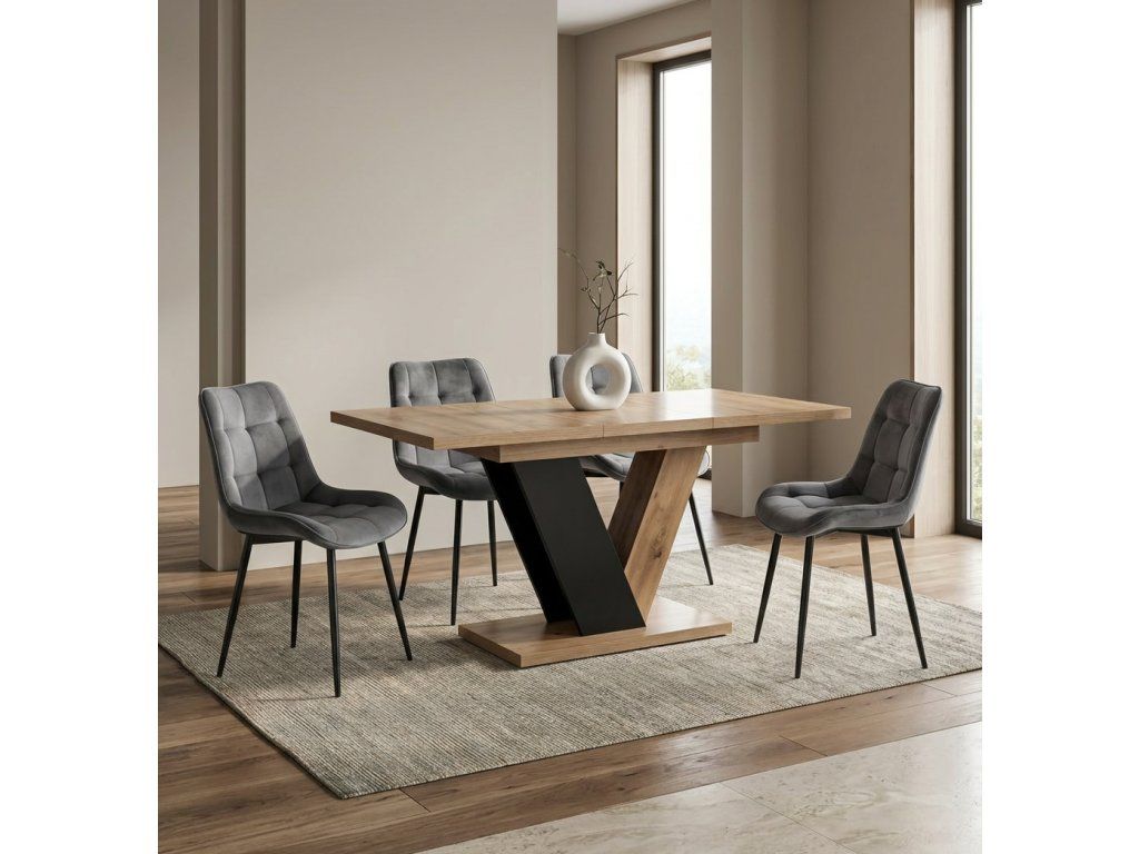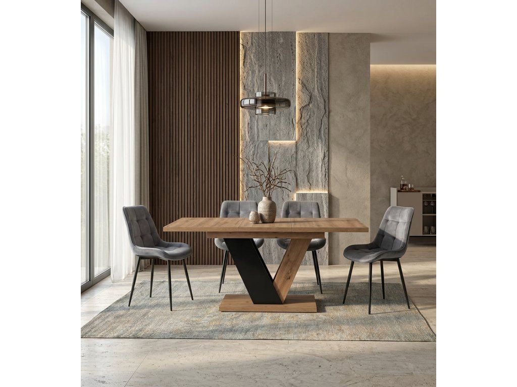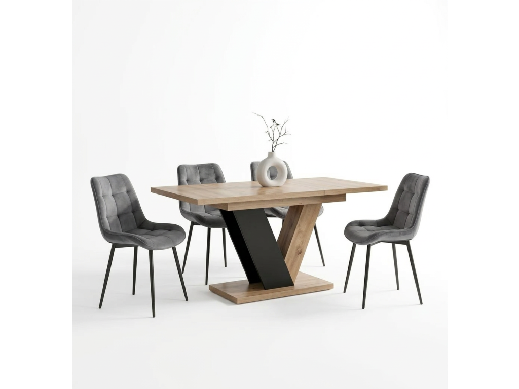Set sa skladá z jedného rozkladacieho stola Clark a štyroch čalúnených jedálenských stoličiek Chris, ktoré spolu vytvárajú praktickú a vizuálne zladenú zostavu vhodnú do modernej jedálne alebo kuchyne.