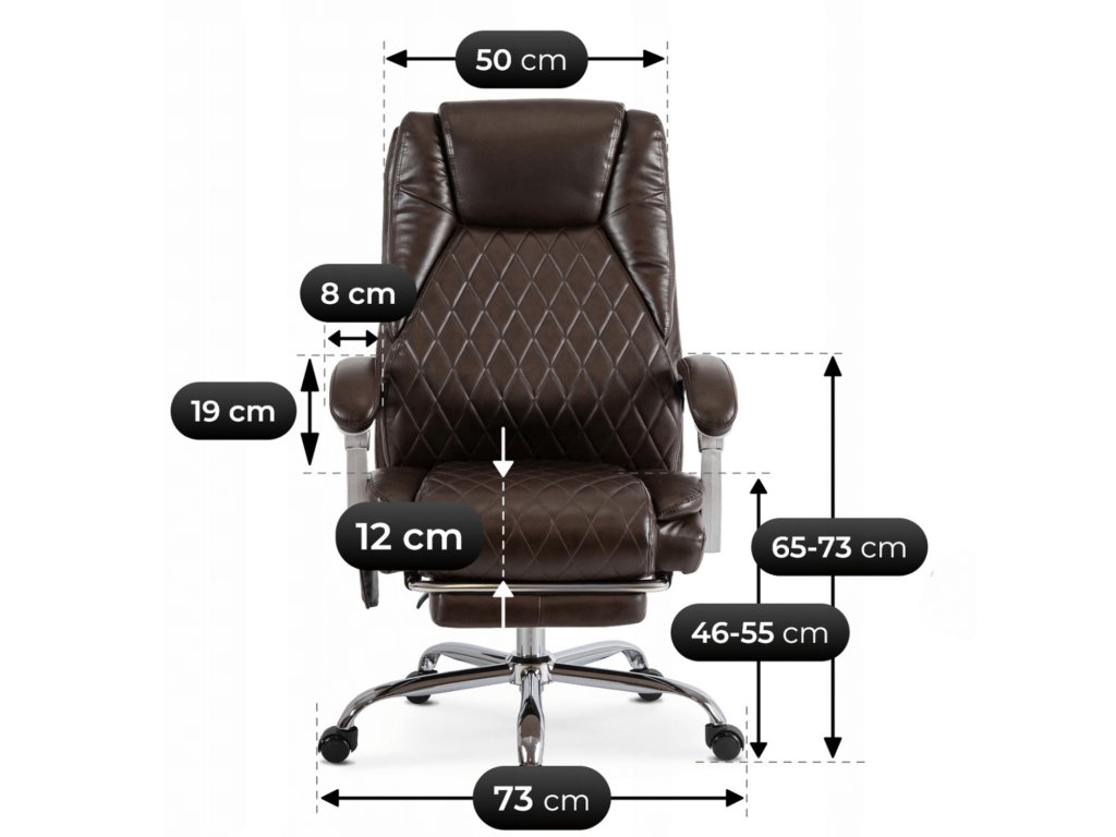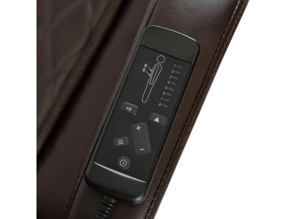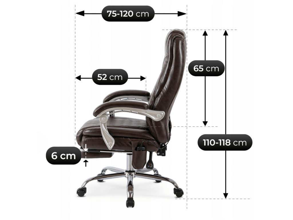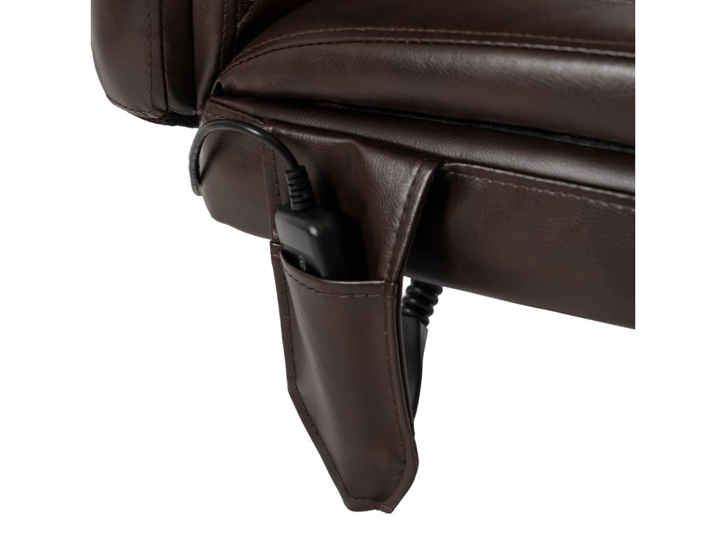 Masážna ( vybračná ) funkcia s vyhrievaním sa ovláda praktickým diaľkovým ovládačom, uloženým v bočnom vrecku kresla. Vysúvateľná podnožka, nastaviteľné operadlo a ergonomický tvar umožňujú pohodlné polohovanie pri práci aj oddychu. Pevná konštrukcia s nosnosťou 150 kg zaručuje stabilitu a bezpečnosť, zatiaľ čo tiché kolieska uľahčujú presúvanie.