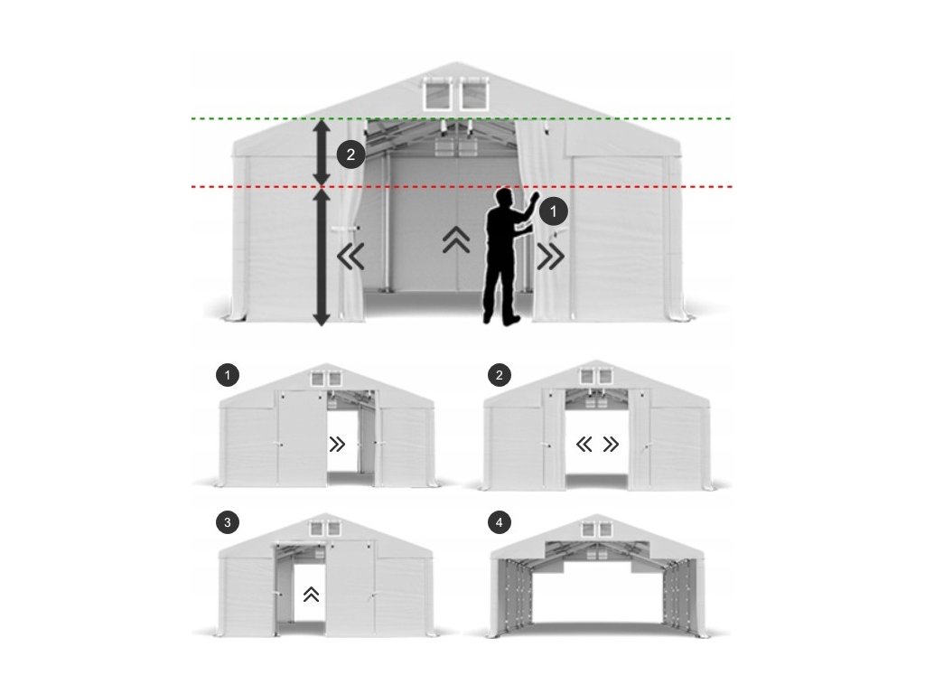 Naše haly majú inovatívny vjazd TYPU ZÁVES. Plachta sa odťahuje na dve strany. Je to pohodlný systém otvárania, ktorý môže obsluhovať iba JEDNA OSOBA. Vďaka novému systému sme získali VYŠŠÍ VJAZD.