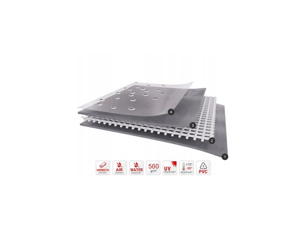 Používame iba pevné PVC, podobné ako sa používa pri nákladných vozidlách TIR. Šitie má vysokú gramáž, odolnosť voči UV žiareniu a voči teplotám od – 40 do + 60 °C. Rovnako je 100 % vodeodolné. Stan je vybavený systémom AIR CONTROL, ktorý predchádza zrážaniu vody v stane. Dodatočne bol stan vybavený tesniacimi suchými zipsami – systémom HERMETIC. Bočné steny majú retenčnú zásteru.