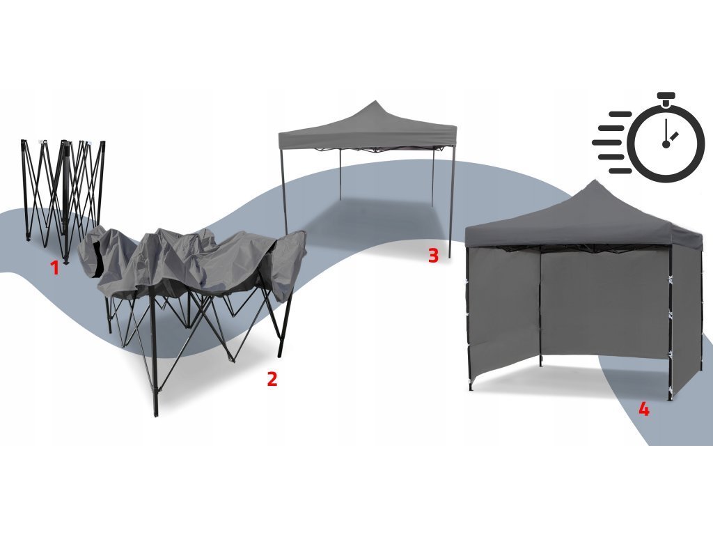 - rýchle rozloženie a zloženie nožnicového stanu (1 osoba cca 1 minúta), na zostavenie altánku nepotrebujete žiadne náradie, všetky prvky potrebné na inštaláciu sú súčasťou súpravy