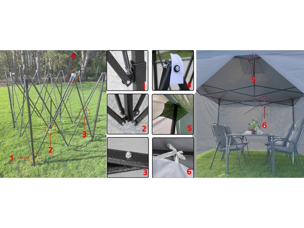 - rýchle rozloženie a zloženie nožnicového stanu (1 osoba cca 1 minúta), na zostavenie altánku nepotrebujete žiadne náradie, všetky prvky potrebné na inštaláciu sú súčasťou súpravy
