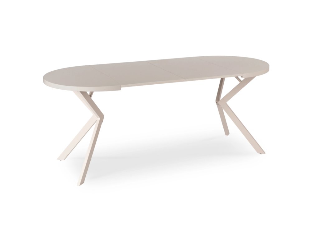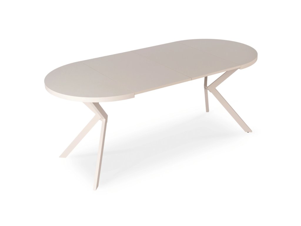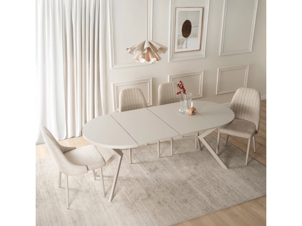 Stôl sa rozkladá pomocou vkladacích dielov, ktoré umožnia plynulo zväčšiť plochu z kompaktného okrúhleho stola na plnohodnotný jedálenský stôl s dĺžkou až 190 cm.