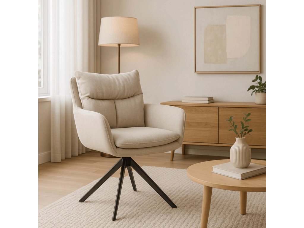 Čalúnenie z kvalitnej látky je mäkké, príjemné na dotyk a odolné pri každodennom používaní. Elegantný béžový odtieň dodáva interiéru harmóniu a jednoducho sa kombinuje so svetlým aj tmavým nábytkom. Stabilná kovová konštrukcia v čiernej farbe garantuje bezpečné používanie a dlhodobú odolnosť.