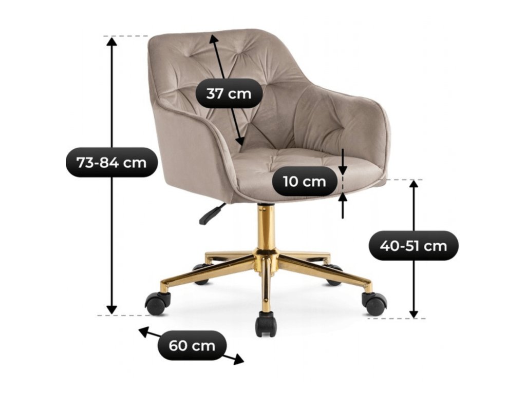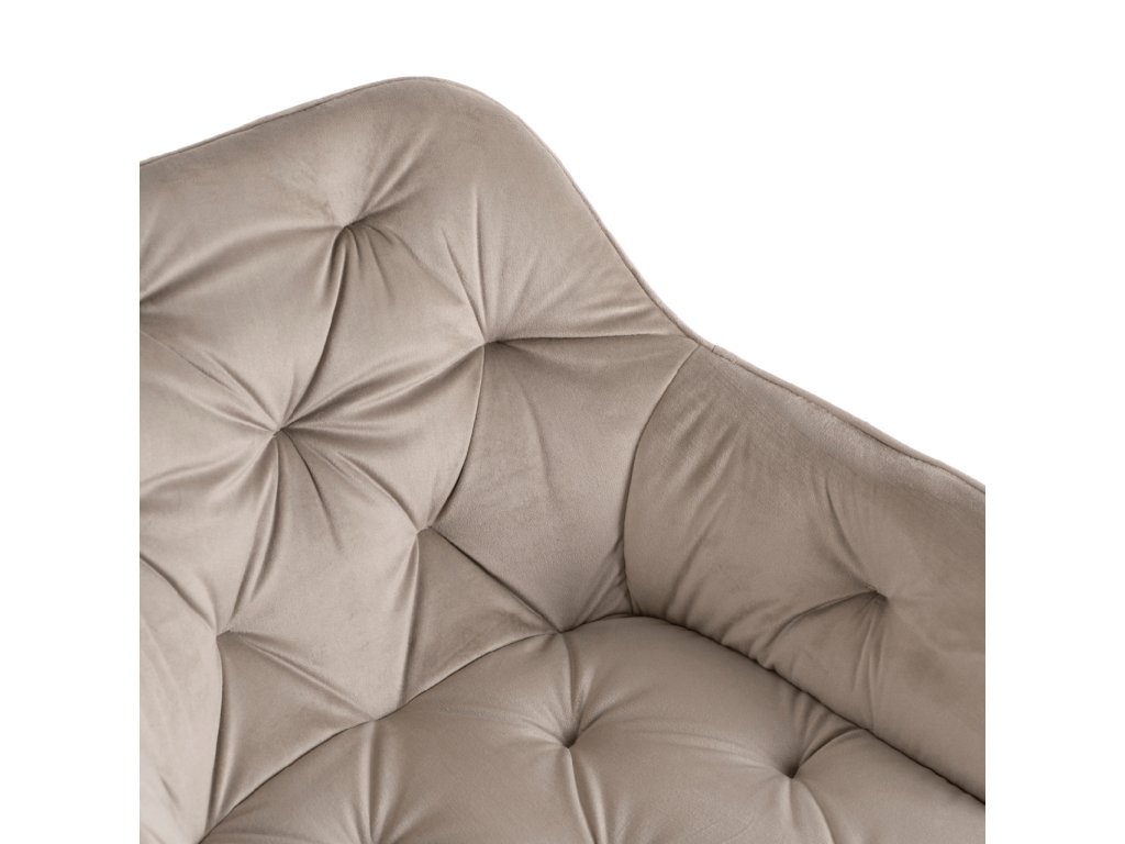 Konštrukcia je z kovu so zlatou povrchovou úpravou, ktorá je pevná pri dennom používaní a dobre znáša časté otáčanie aj presúvanie. Sedadlo je čalúnené zamatom, ktorý je mäkký na dotyk, drží tvar a pôsobí útulne v interiéri. Látka nepriťahuje chlpy a ľahko sa udržiava, čo je praktické najmä v domácnosti s deťmi alebo domácimi zvieratami.