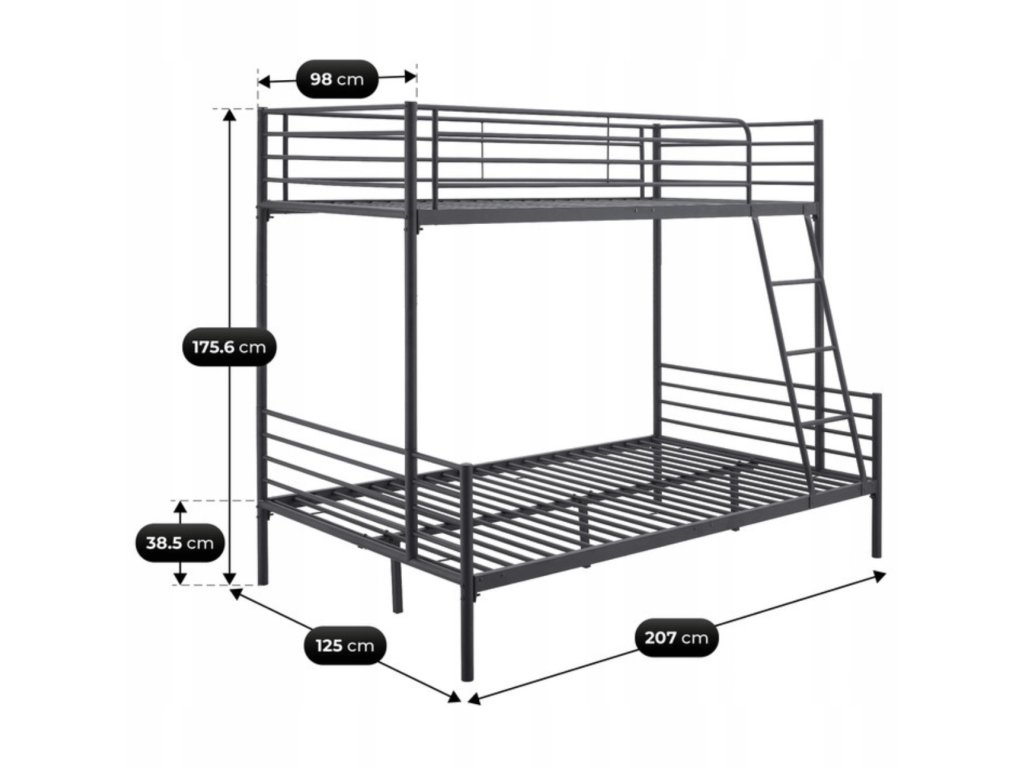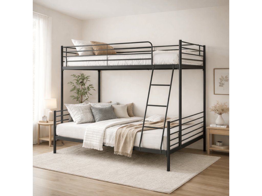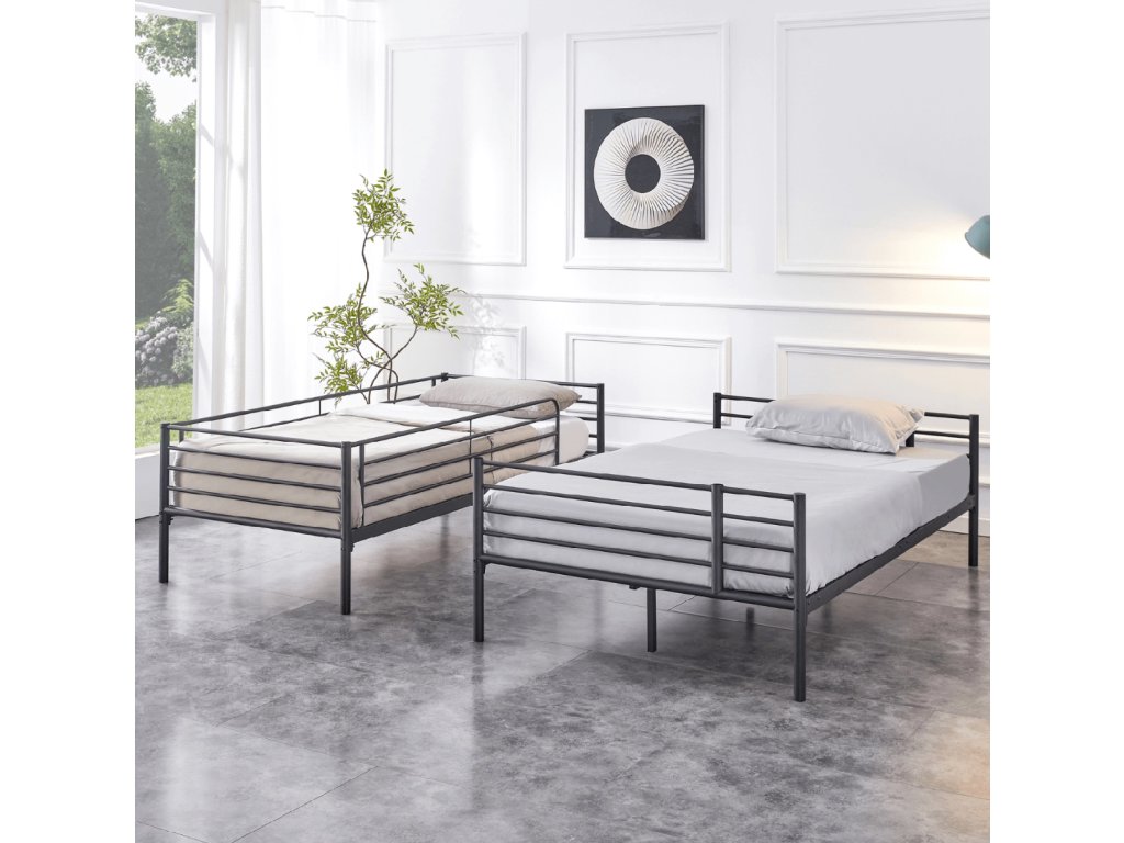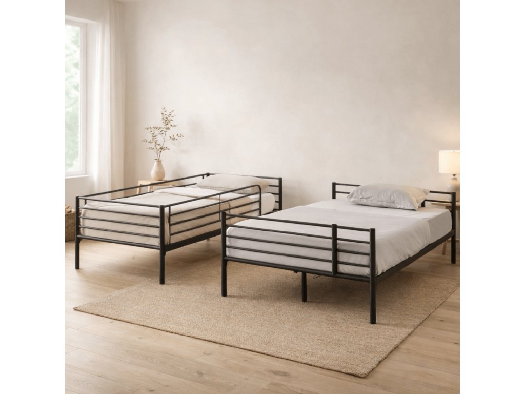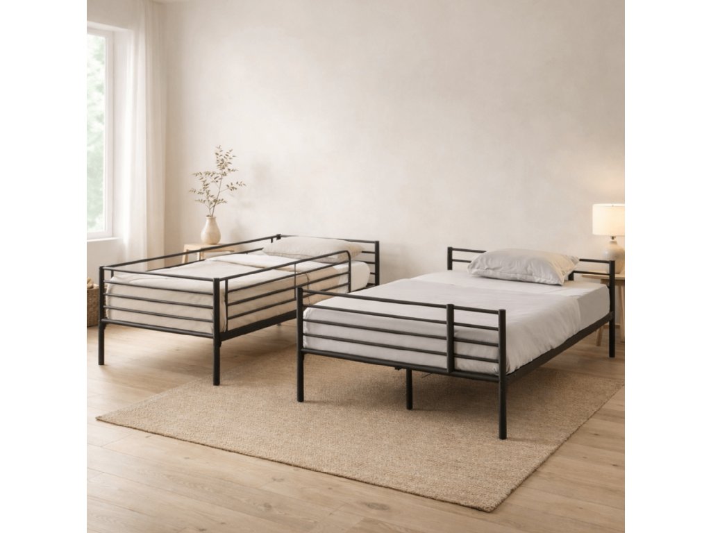 Hľadáte posteľ, ktorá ušetrí miesto a prispôsobí sa menšej izbe? Dvojitá kovová posteľ 2 v 1 rieši nedostatok priestoru v detských izbách, prenájmoch alebo hosťovských izbách. Môžete ju používať ako klasickú poschodovú posteľ alebo rozložiť na dve samostatné lôžka vedľa seba.