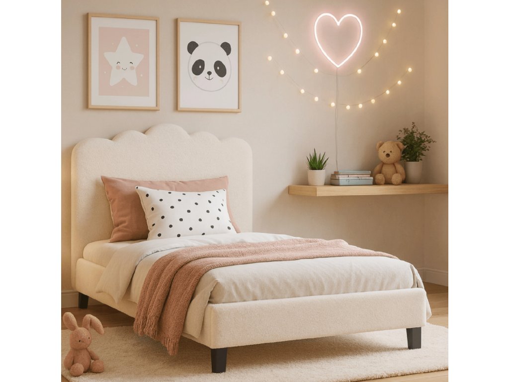 Hľadáte posteľ, ktorá pôsobí jemne, útulne a vytvorí bezpečný priestor pre odpočinok? Posteľ v krémovej buklé látke je ideálna pre tínedžera, mladého človeka alebo pre rodiča, ktorý chce dopriať dieťaťu útulnú izbu. Mäkké čalúnenie pripomínajúce plyš dodáva interiéru teplo a trendový vzhľad, ktorý si mladá generácia okamžite zamiluje.