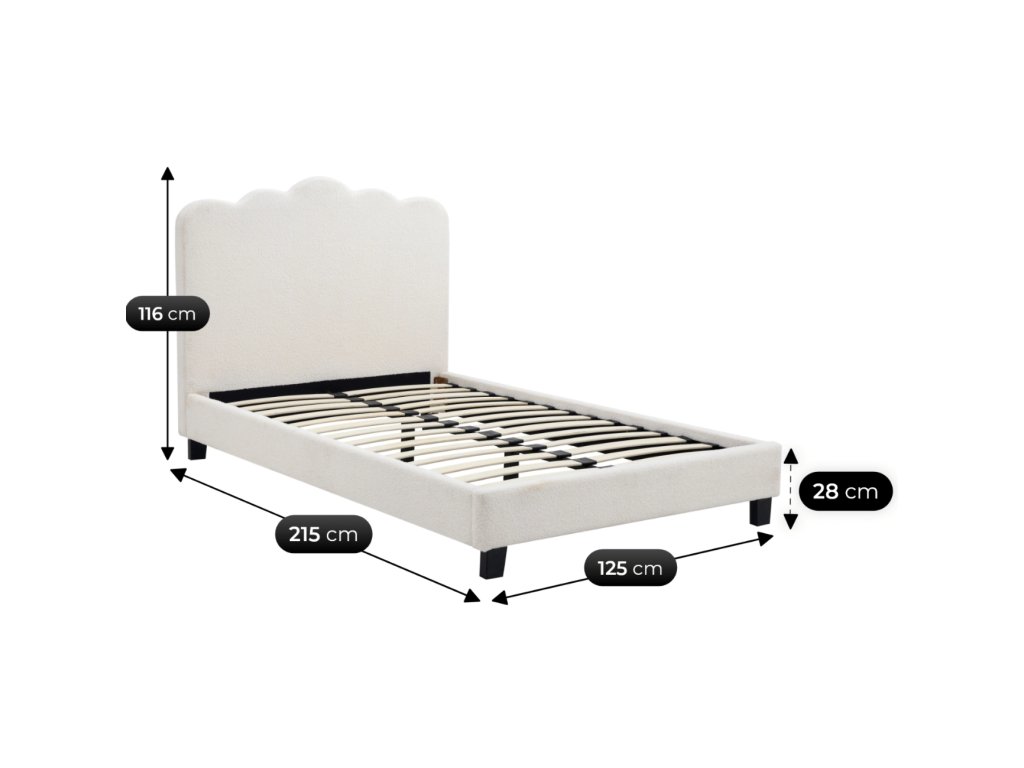 Mäkká buklé látka je príjemná na dotyk a vytvára pocit tepla už pri prvom pohľade. Jej jemná krémová farba krásne doplní pastelové odtiene, minimalistické izby aj moderné interiéry. Vysoké čalúnené čelo poskytuje pohodlie pri čítaní, učení či sledovaní mobilu.