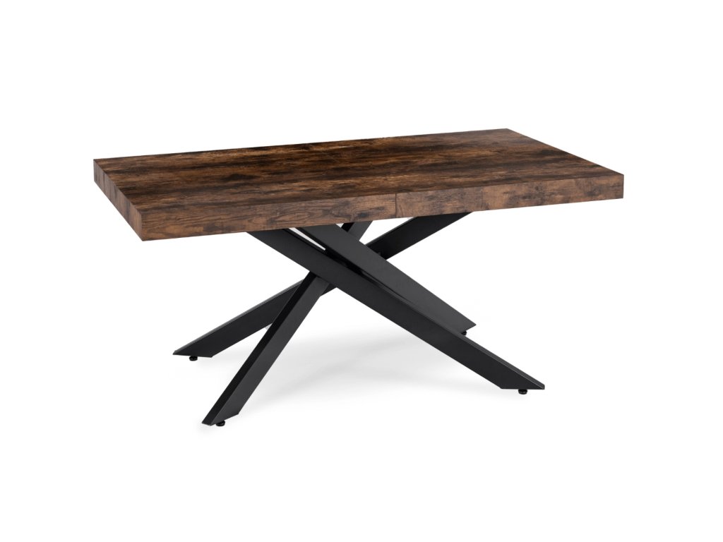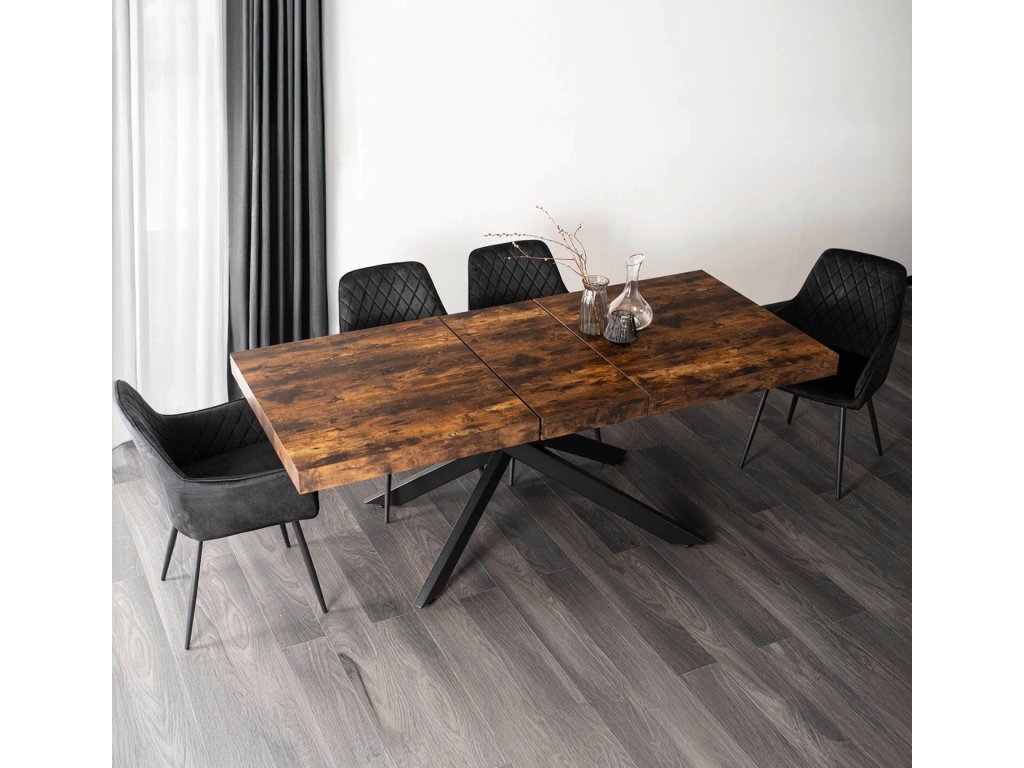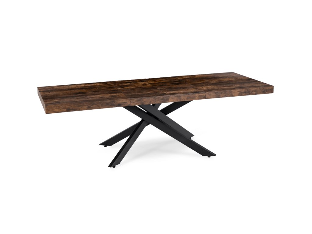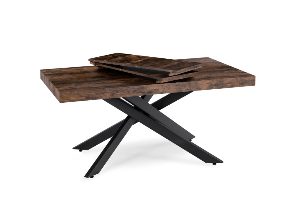 Doska je vyrobená z odolnej MDF dosky v dekore dub, ktorá je nenáročná na údržbu a odoláva bežnému opotrebeniu. Masívna čierna kovová konštrukcia zabezpečuje stabilitu aj pri plnom rozložení a vytvára atraktívny vzhľad. Vďaka kombinácii dreva a kovu pôsobí stôl elegantne, no zároveň moderne, hodí sa do interiérov, ktoré spájajú funkčnosť s dizajnom.