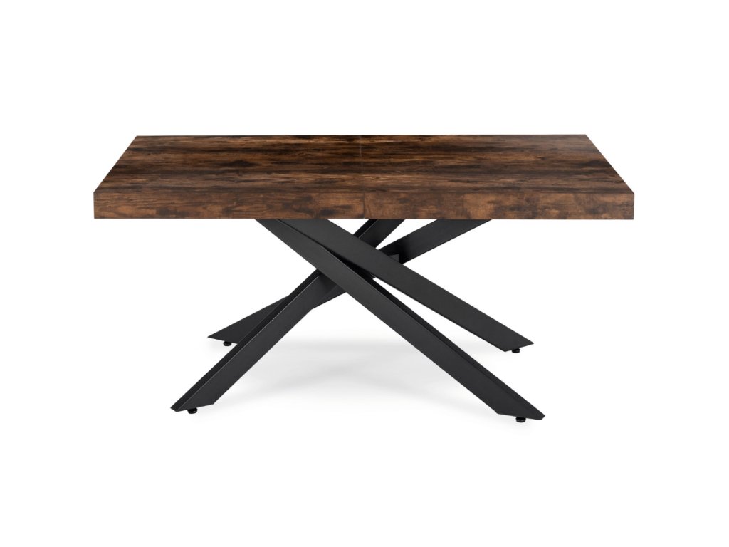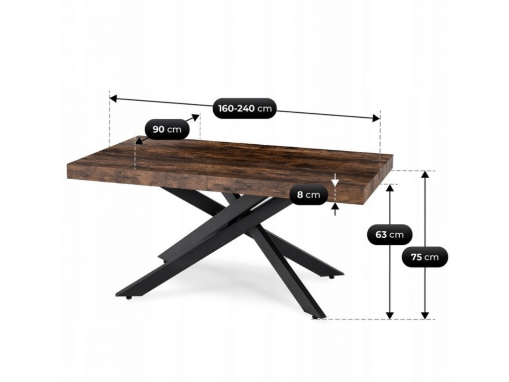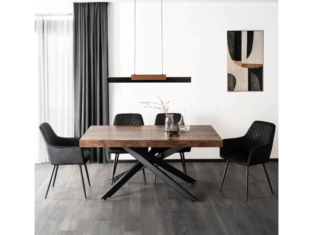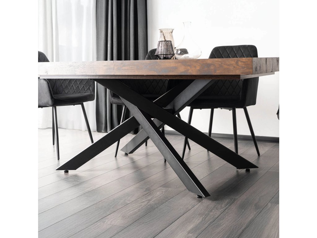 Doska je vyrobená z odolnej MDF dosky v dekore dub, ktorá je nenáročná na údržbu a odoláva bežnému opotrebeniu. Masívna čierna kovová konštrukcia zabezpečuje stabilitu aj pri plnom rozložení a vytvára atraktívny vzhľad. Vďaka kombinácii dreva a kovu pôsobí stôl elegantne, no zároveň moderne, hodí sa do interiérov, ktoré spájajú funkčnosť s dizajnom.