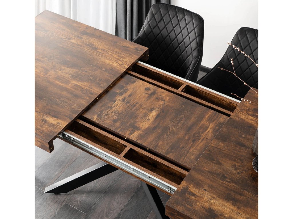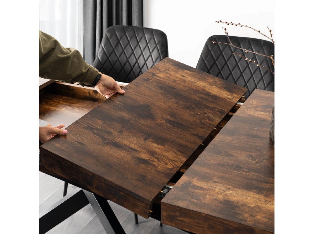 V základnej verzii má stôl dĺžku 160 cm, no vďaka dvojitému výsuvnému systému sa dá jednoducho rozšíriť až na 240 cm. Vložky sú uložené priamo pod stolovou doskou, takže ich máte vždy po ruke. Rozkladací mechanizmus je plynulý a zvládnete ho bez námahy, ideálne riešenie, pre hostí alebo oslavu.