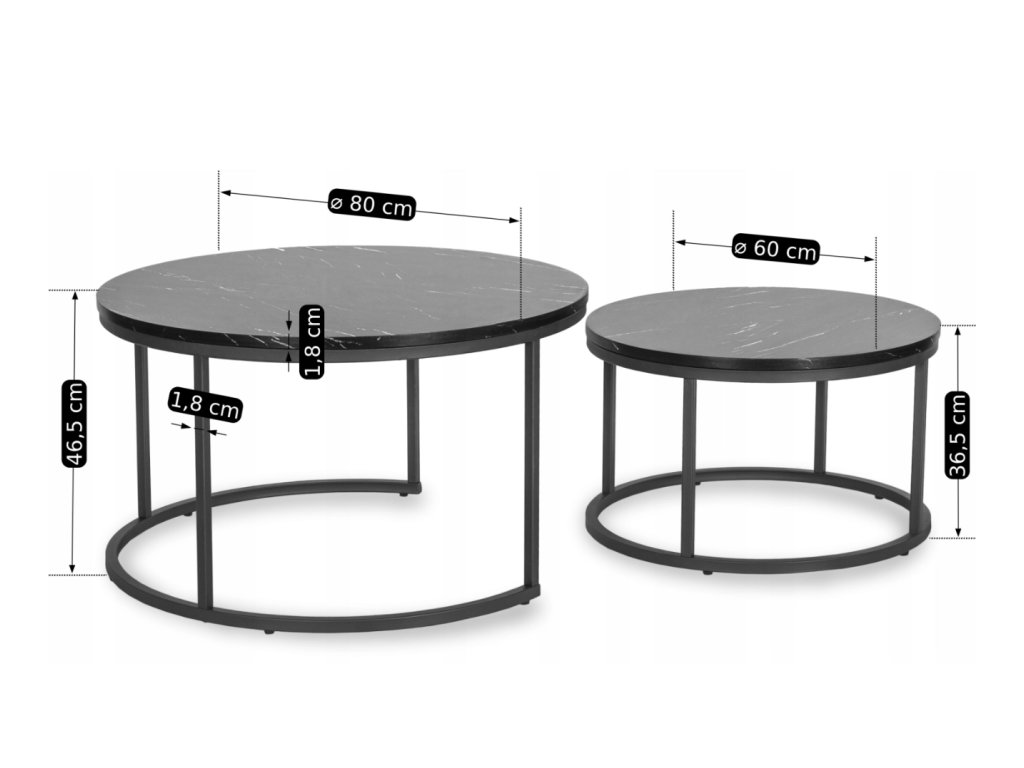 Menší stolík má priemer 60 cm a výšku 36,5 cm, väčší stolík má priemer 80 cm a výšku 46,5 cm.