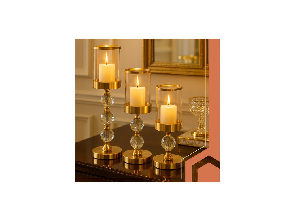 Sada obsahuje tri sklenené svietniky v rôznych výškach. Sklo dopĺňa kov a EVA spodná časť, ktorá zvyšuje stabilitu a chráni nábytok. Zlatá farba a priehľadné sklo patria medzi doplnky, ktoré ladia s moderným aj glamour štýlom. Svetlo z čajovej sviečky vytvára jemné odlesky a pôsobí veľmi domácky.