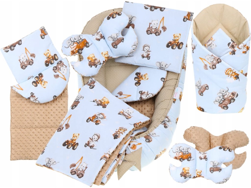 Set do postieľky, 7 dielny, vzor: zvieratká na cestách, farba: béžová, svetlo modrá, materiál: bavlna, minky, v balení: hniezdo, antišokový vankúš, prikrývka, matrac, plochý vankúš, zavinovačka, bavlnený obal, pranie v práčke pri teplote: 40°C