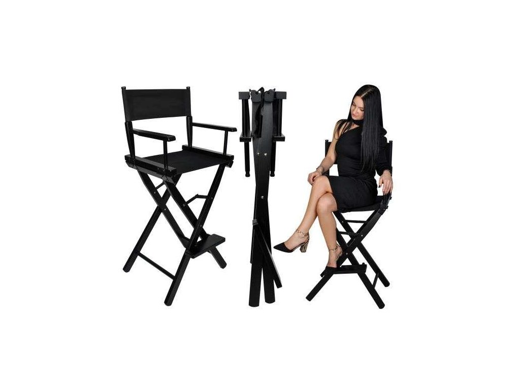 Stolička na líčenie skladacia, dĺžka v zloženom stave: 50 cm, šírka v zloženom stave: 19 cm, výška v zloženom stave: 91 cm, dĺžka v rozloženom stave: 40 cm, šírka v rozloženom stave: 54 cm, výška v rozloženom stave: 116 cm, farba: čierna, materiál: drevo, železo, 600D oxford látka, maximálne zaťaženie: 140 kg, hmotnosť: 6,35 kg