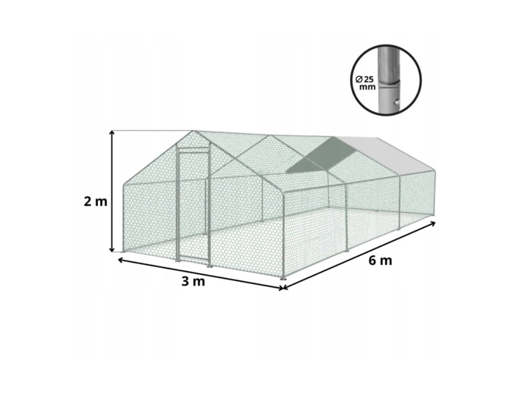 Priestranný pôdorys 3 × 6 m a výška 2 m ponúkajú dostatok miesta na voľný pohyb, čím sa podporuje fyzická aktivita a celková pohoda zvierat. Plachta zabraňuje prehrievaniu interiéru a vytvára príjemné vnútorné podmienky počas celého roka. Výbeh je vhodný nielen pre kurčatá, ale aj pre králiky, kačky či iné malé zvieratá.