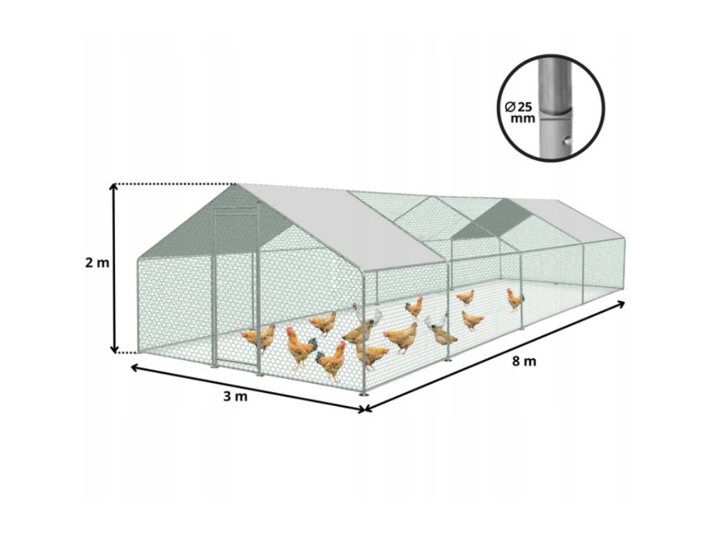 Priestranný pôdorys 3 × 8 m a výška 2 m ponúkajú dostatok miesta na voľný pohyb, čím sa podporuje fyzická aktivita a celková pohoda zvierat. Plachta zabraňuje prehrievaniu interiéru a vytvára príjemné vnútorné podmienky počas celého roka. Výbeh je vhodný nielen pre kurčatá, ale aj pre králiky, kačky či iné malé zvieratá.