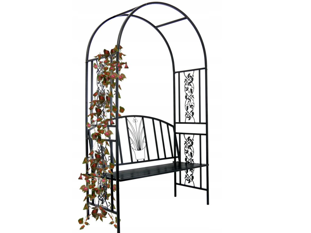 Kovová ozdobná pergola s lavicou slúži ako konštrukcia pre popínavé kvety, ruže a iné rastliny.