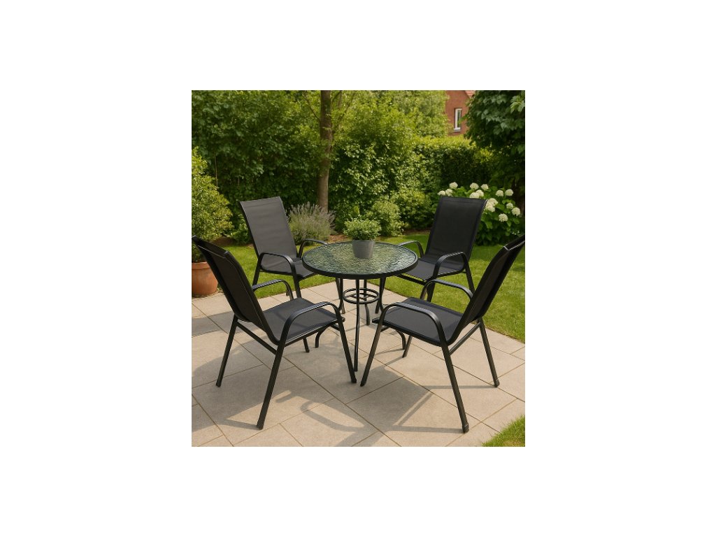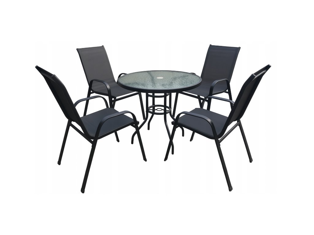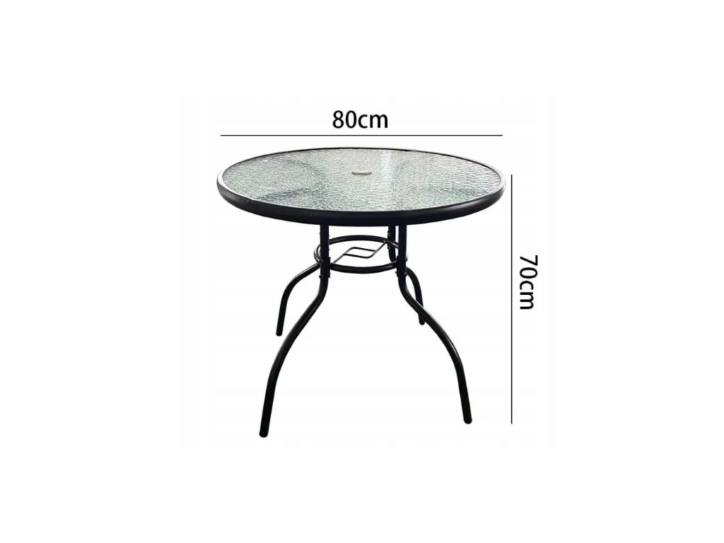 Konštrukcia stola aj stoličiek je vyrobená z ocele s práškovou úpravou, ktorá odoláva korózii aj zmenám počasia. Stolová doska je zo skla, čo dodáva súprave moderný vzhľad a jednoduchú údržbu.