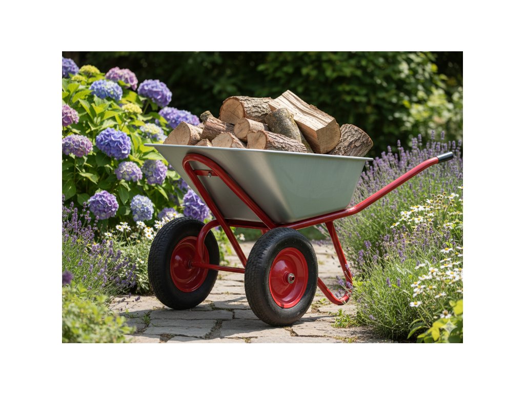 Záhradný vozík je vybavený veľkými gumenými kolieskami na kovovom ráfiku, ktoré umožňujú plynulý pohyb aj na nerovnom povrchu. Riešenie znižuje námahu pri tlačení a zlepšuje ovládateľnosť pri plnom zaťažení.