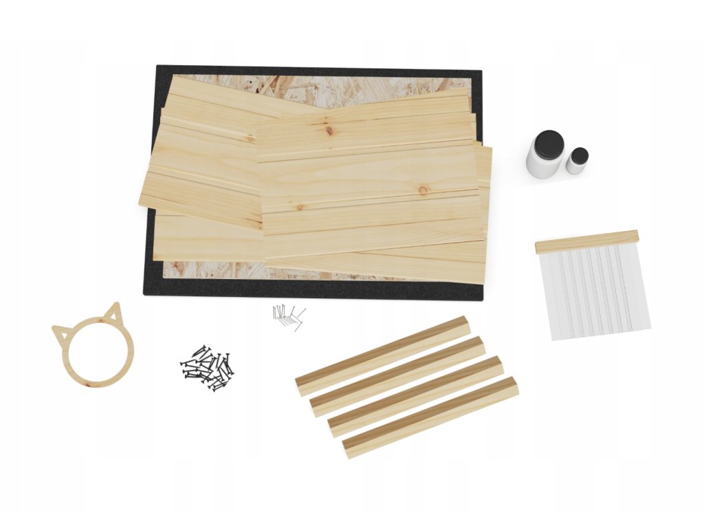Domček pre mačky je vyrobený zo sušeného borovicového dreva, ktoré zabezpečuje pevnosť a dlhú použivateľnosť. Steny sú obložené 1,5 cm hrubými drevenými doskami, a poskytujú príjemné a bezpečné prostredie pre vaše mačky.